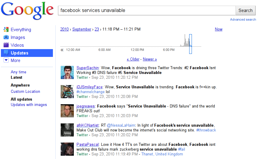 … pero este no ha sido el único sitio donde se ha seguido muy de cerca el estado de la caída de esta red social. Y es que el dato curioso y, incluso quizá, un poco hiriente es que está caída fue muy seguida por los usuarios de esta misma red social (Facebook) en la otra gran red social de microblogging: Twitter.