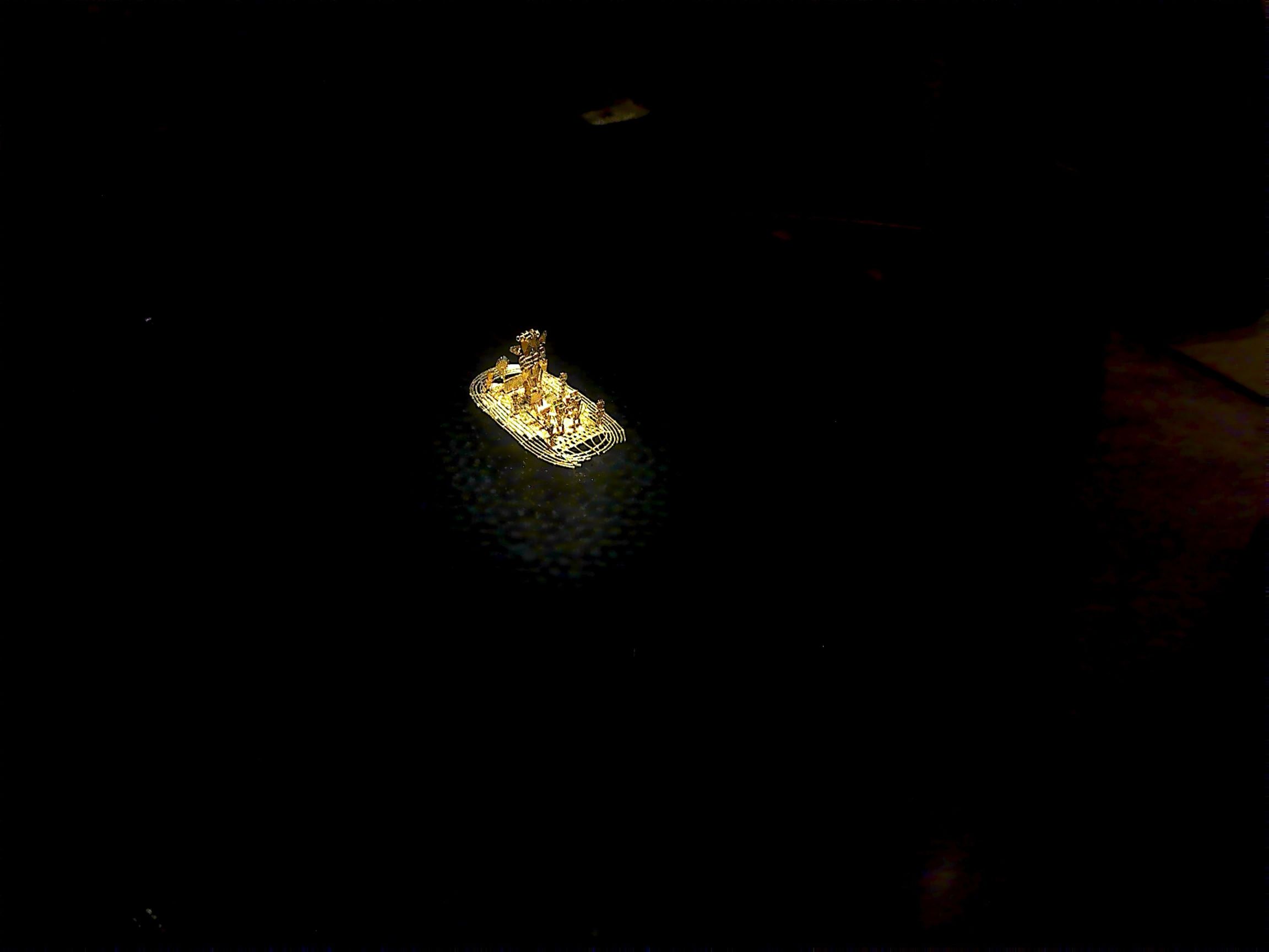 Esta maravillosa pieza, el mejor ejemplo de una figura votiva (ofrenda), mide 19,5 centímetros de largo por 10,1 de ancho y 10,2 de alto. La pieza ha sido elaborada en el período tardío de la cultura Muisca, entre los años 1200 y 1500 D.C.