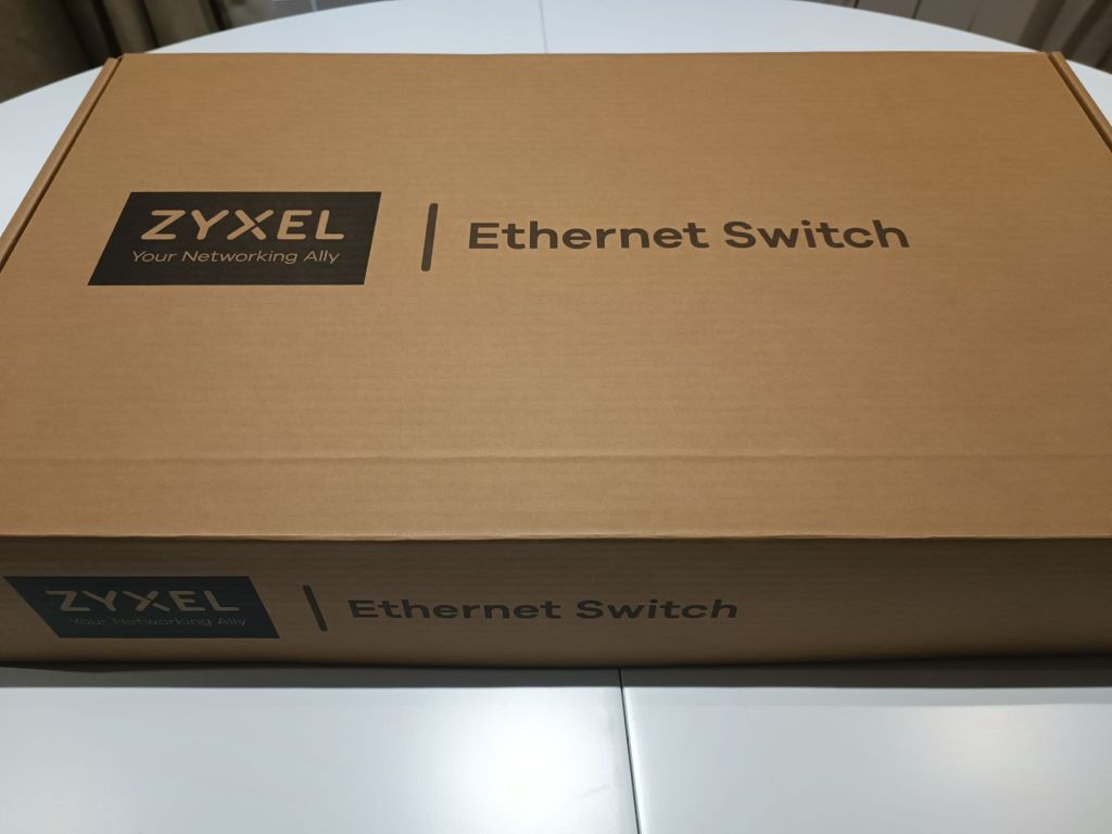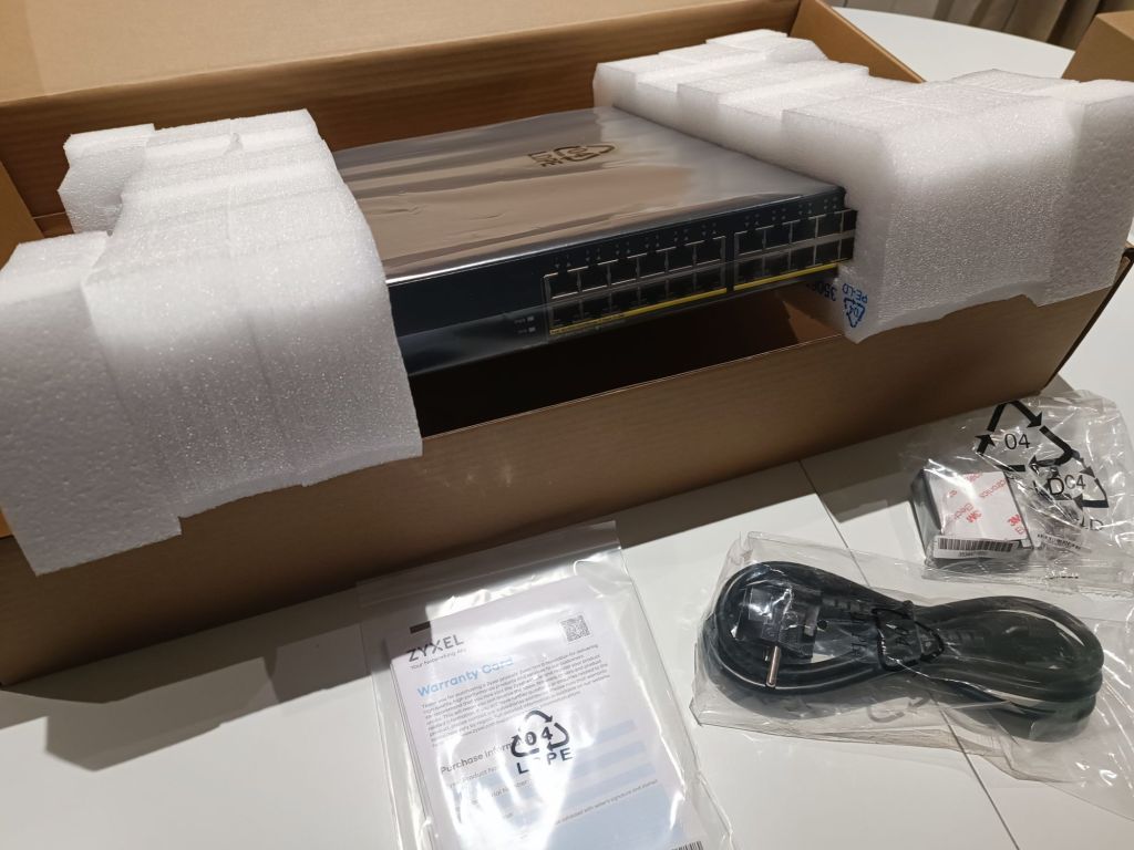 This is how the Zyxel Switch PoE Gigabit GS1900-24HP ethernet switch looks like. The package arrived well-protected, with all necessary rack-mounting hardware included.