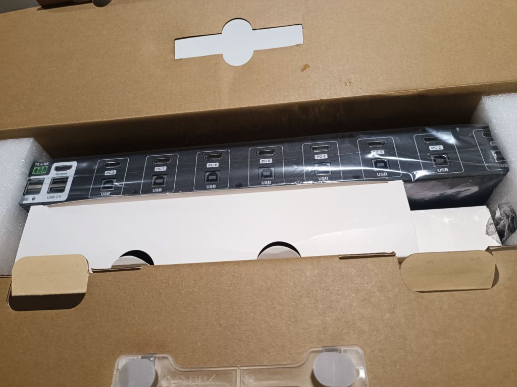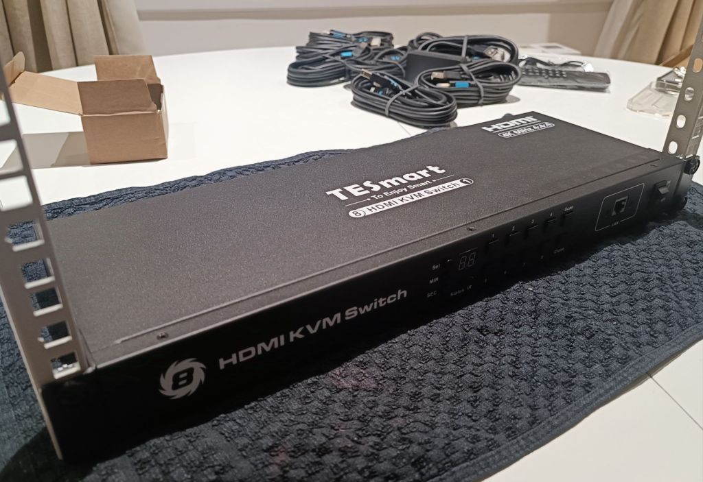 The TESmart KVM HDMI 8-Port 4K60Hz HKS801-E23 also arrived in impeccable condition. A particularly commendable inclusion is the set of eight HDMI/USB cables, one for each port, simplifying the setup process and ensuring compatibility without the need for additional purchases. The KVM also contains all necessary rack-mounting hardware included.