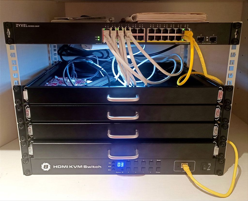 I’m really liking how it’s coming together. It’s a complete transformation from the previous state. The tangled mess of Ethernet cables has been replaced by a metal cabinet that’s much more organized and better distributed. Plus, I now have all the necessary hardware infrastructure for fully remote management of all these mini-computers.